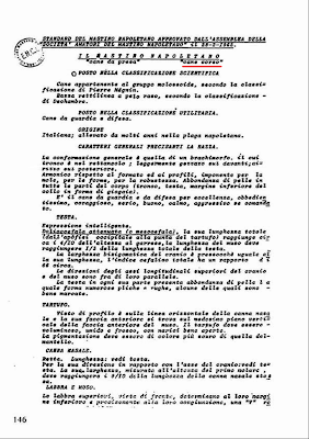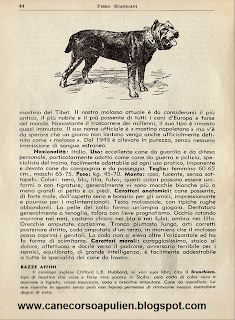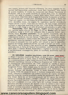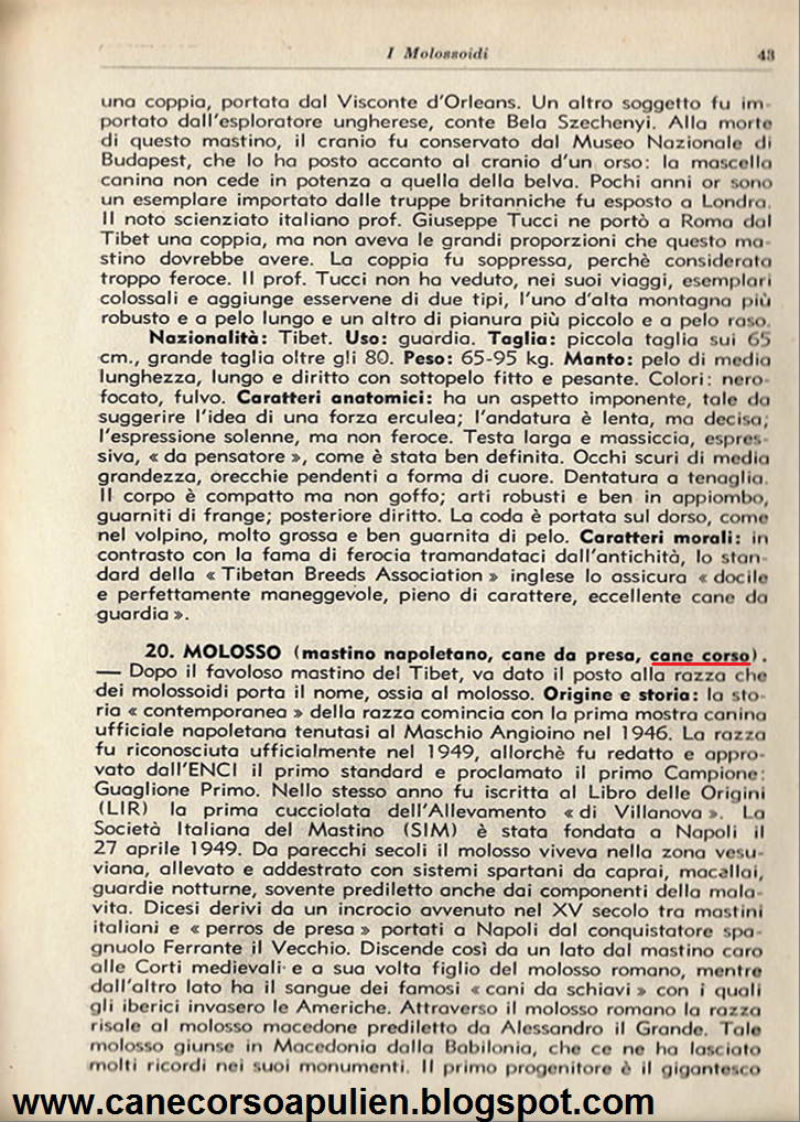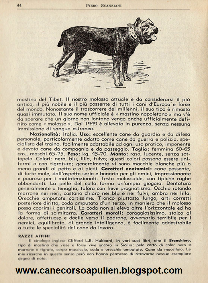 - Première description détaillée contemporaine de ce type de chien dans le livre "300 razze di cane" de Piero SCANZIANI des éditions Pan, faisant foi de post-standard pour plusieurs races, qui à l'époque étaient toutes regroupées sous un même terme, celui de MOLOSSE (les écotypes régionaux mastino napoletano pour la Campanie, cane da presa pour l'ensemble du Midi italien et cane corso pour la région des Pouilles)