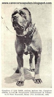 -Lors d'une exposition canine à Milan, Mario MONTI habitant Bagnacavallo (RA), présenta au juge Fabio CAIELLI, un sujet de "Molosse italien" nommé DRAGO ♂, que le juge refusa de le juger affirmant que la race n'existait pas et que le KENNEL CLUB ne lui avait pas émis le standard relatif à cette soi-disante race. MONTI, invita CAIELLI à prendre un billet de car pour Naples et de s'arrêter à Bologne, Florence, Pise, Livourne, Grosseto, Civitavecchia, Rome, où il avait pu voir et de manière toujours plus croissante des cani corsi utilisés par des privés et des gardiens de nuit. Il avait pu en observer un très grand nombre à Naples, Foggia, Benevento, Barletta et Bari, aussi bien en milieu citadin qu'en milieu rural.