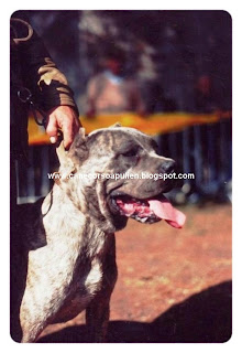 "... La direction des axes de la tête qui dans notre cas doivent être bien visiblement convergents . On rencontre souvent ...une hypertrophie excessive des masséters. Pénaliser de manière excessive les dentures en ciseaux ou celles en tenaille semble exagérée. Je dis que devant une bonne quadrature de museau et une correcte direction des axes, je ne peux raisonnablement pas pénaliser une denture qui n'est pas parfaitement correcte. ..."